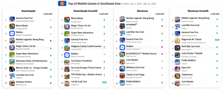 Sensor Towe发布的2025第一季度东南亚地区手游下载、收入TOP10名次榜,MLBB的收入榜位居第一,下载榜位列第四,以致它的生息居品MGCC不才载榜和下载增长榜单中都能排到了第5和第2。